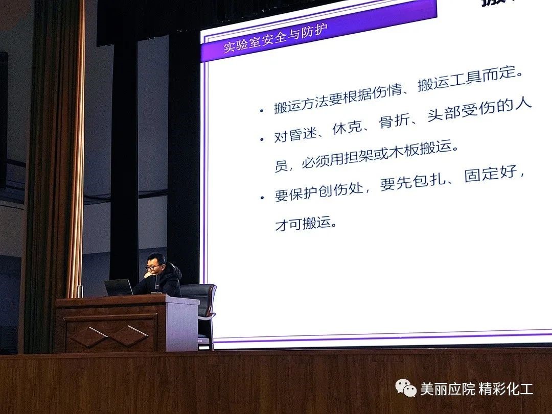 舒航老师通过展示化学实验室里发生的真实的事故案例和触目惊心的图片,让同学们深刻理解了实验安全的重要性。他为大家分析了实验室中存在的危险源以及事故发生的原因等,以及遇到突发事件后,应当采取的急救原则和技能。