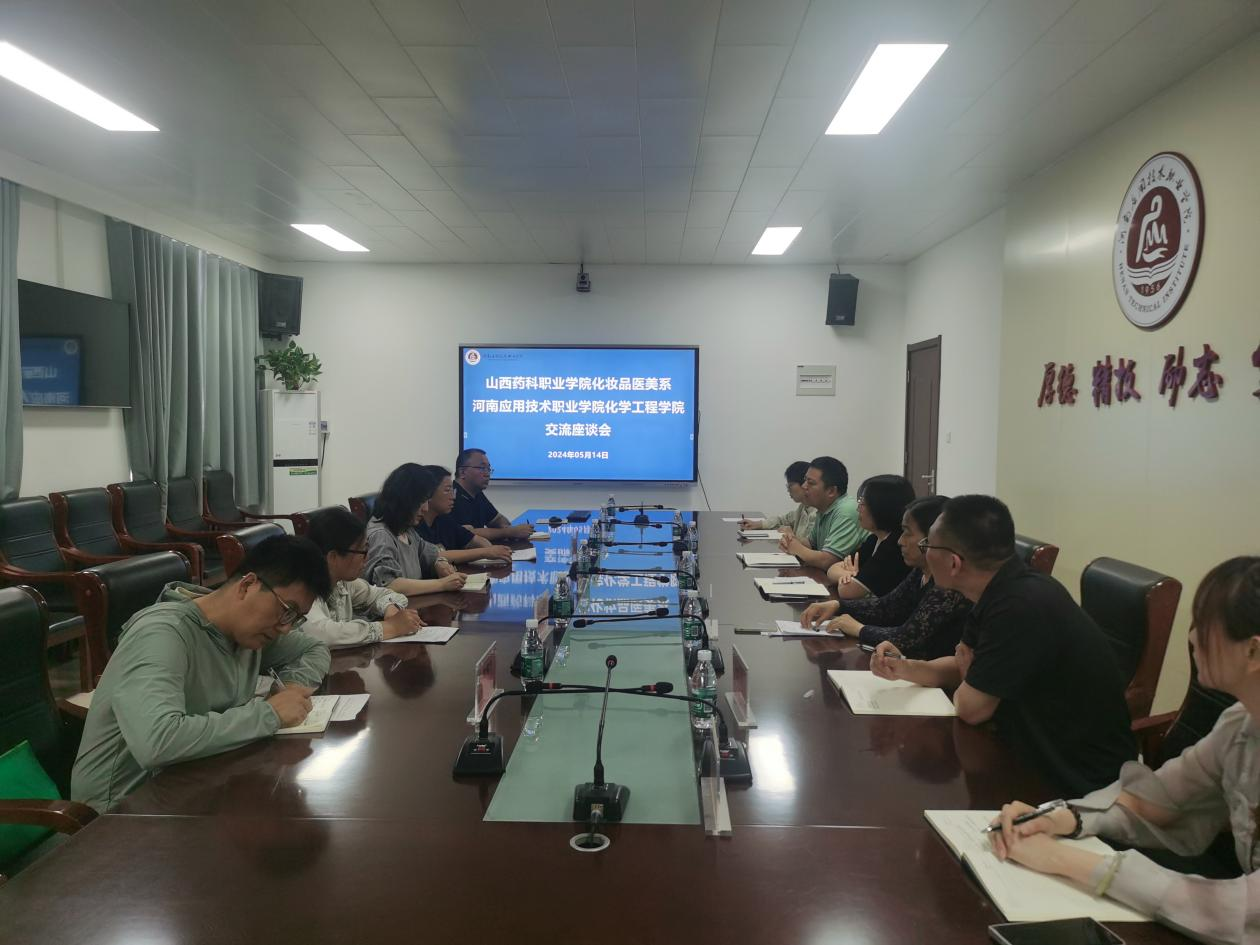 5月14日,山西药科职业学院化妆品医美系党总支书记范张姣、主任贾文雅,中药系主任蔡翠芳教授等一行5人到我院开展调研交流,我院党总支书记陈永惠,副院长岳瑞丰、柴凤兰出席,化妆品专业骨干教师参加了交流座谈。
