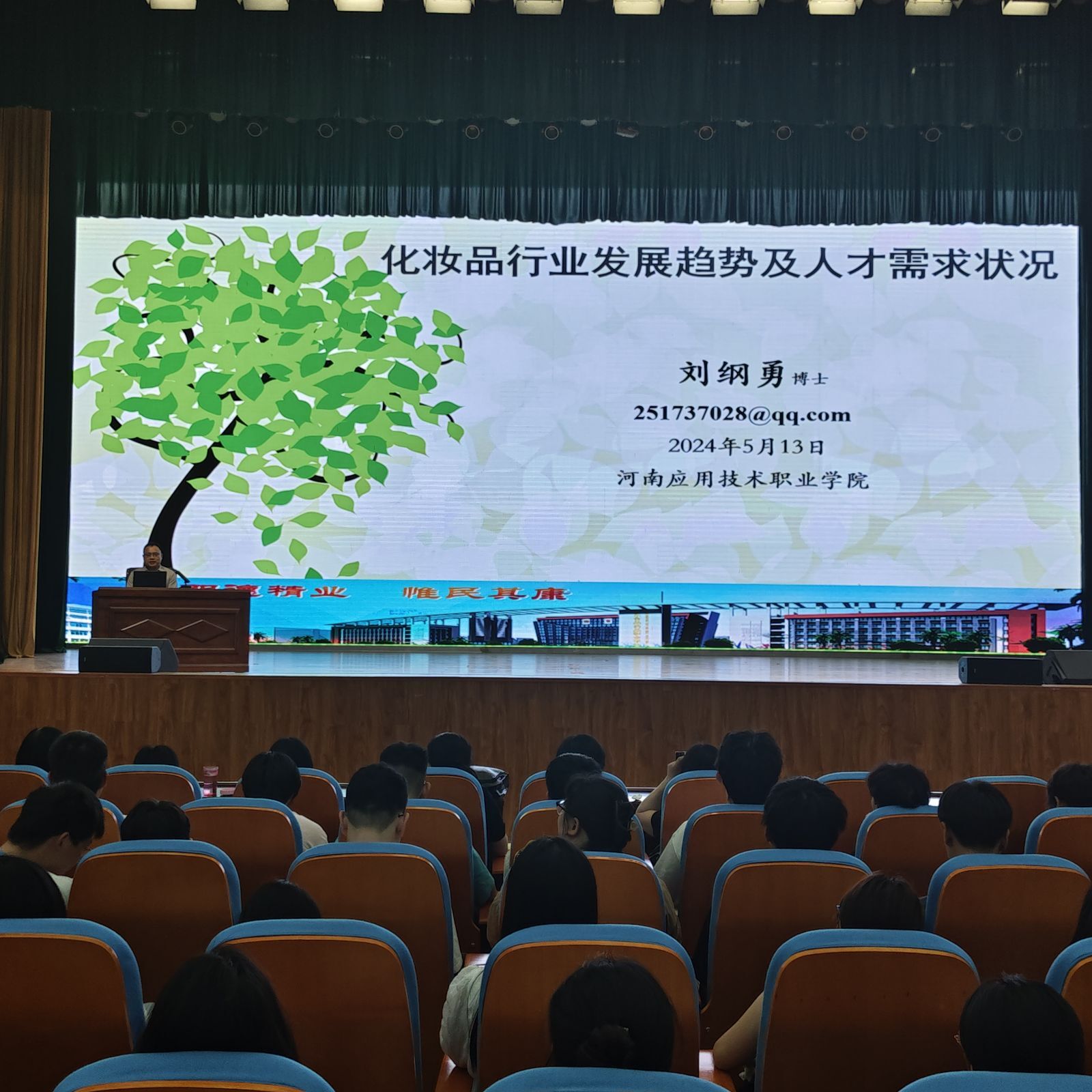 2024年5月14日,广东食品药品职业学院化妆品技术专业学科带头人、广东省化妆品科学技术研究会创始会长、全国轻工职业教育教学指导委员会日用化工专委会委员、全国药品职业教育教学指导委员化妆品专委会委员刘纲勇博士应邀来到我院指导化妆品专业建设,并给化妆品经营与管理专业全体师生作了题为《化妆品行业发展趋势及人才需求》的专题讲座。