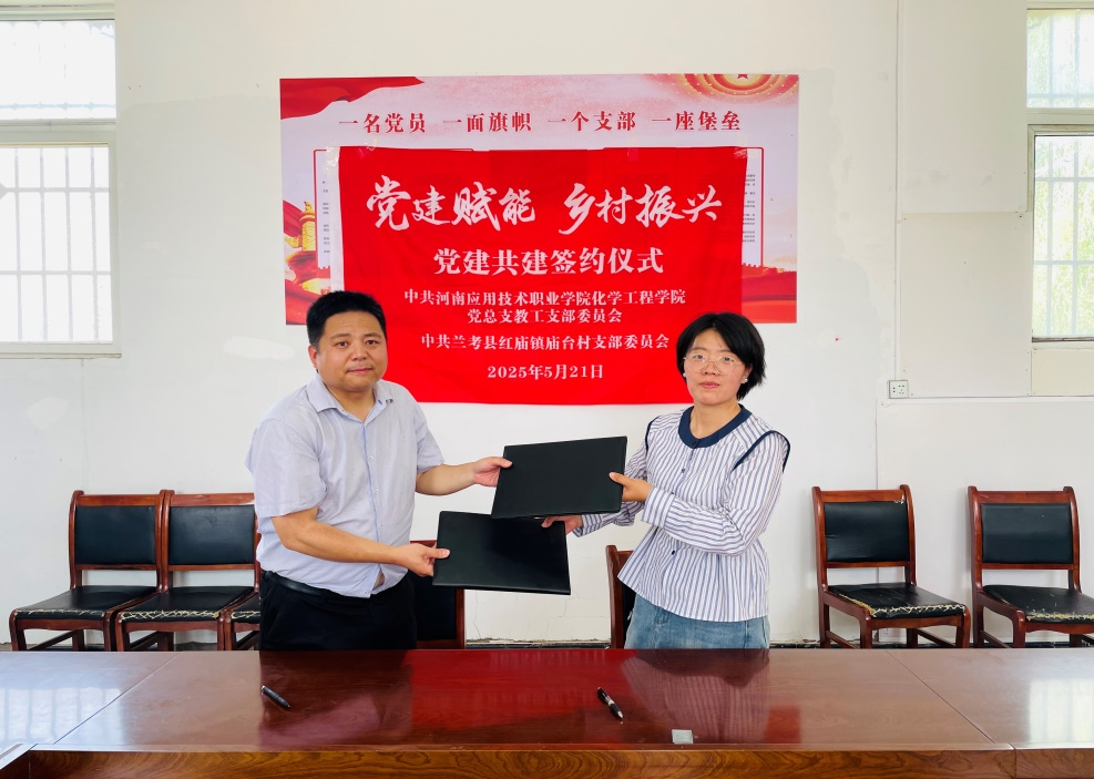 活动结束后,中共河南应用技术职业学院化学工程学院党总支教工支部委员会与中共兰考县红庙镇庙台村党支部委员会签订《乡村振兴技术帮扶协议》,推动专业与产业对接、教学过程与生产过程对接,在党建赋能乡村振兴的同时,进一步提升应用化工技术高水平专业群建设。化学工程学院党总支书记陈永惠、党总支副书记常惟诚、副院长岳瑞丰,协管员范雨欣及驻村第一书记任旭凯、队员李盈、陈开友等共同参与签约活动。