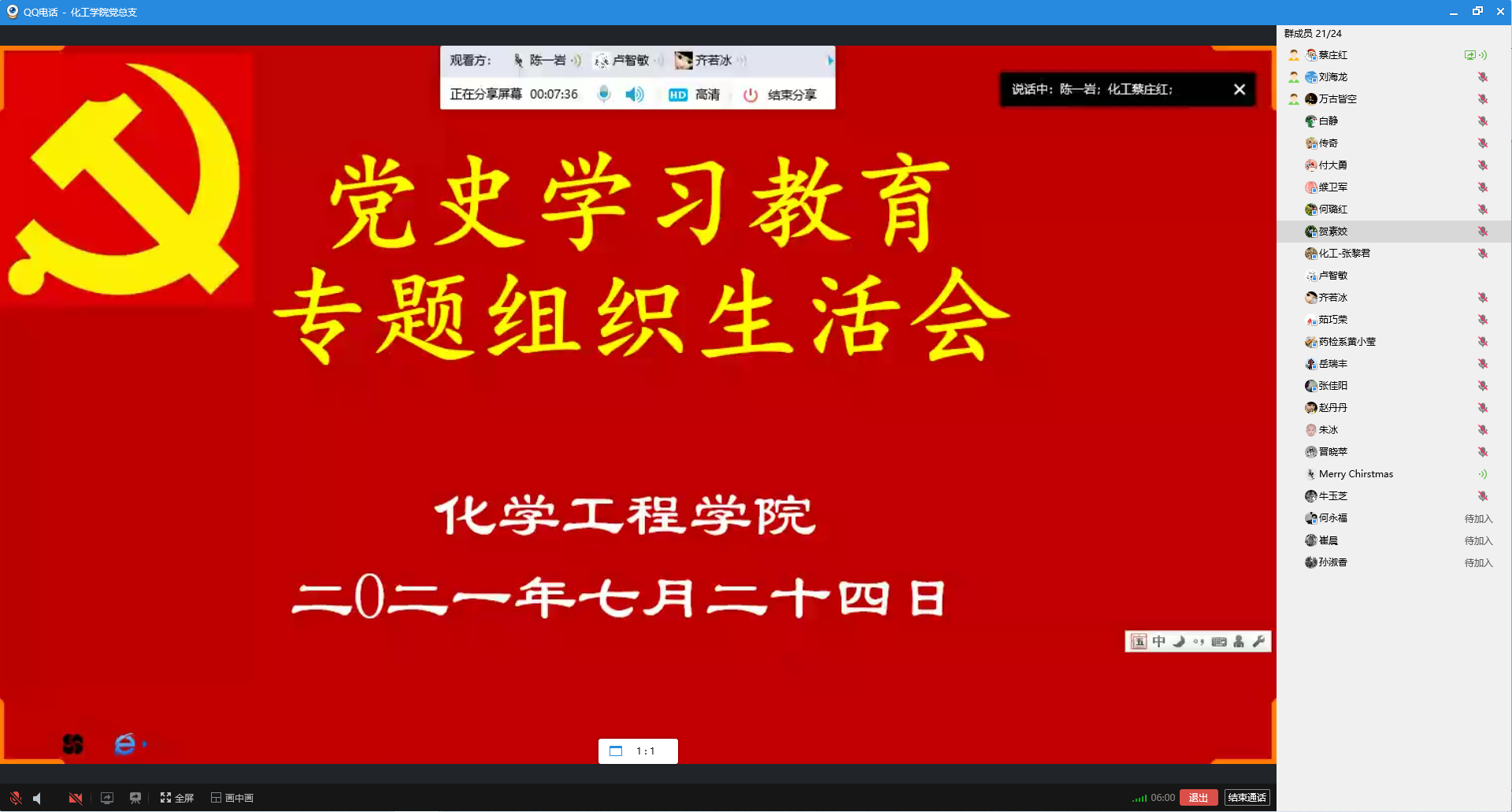 根据我校党委关于开好党史学习教育专题组织生活会的各项要求,持续推动全校师生党员学习讲话精神往深里走、往实里走,切实提高学校基层党的政治生活质量。2021年7月24日,化学工程学院党总支组织召开党史学习教育专题组织生活会,把专题组织生活会的筹备和组织过程作为师生党员领悟讲话精神、深化党史学习、凝聚精神力量、共同创新奋进的一次极其重要的政治生活,会议由学院党总支书记蔡庄红主持,院院长朱冰等21名党员参加了会议。