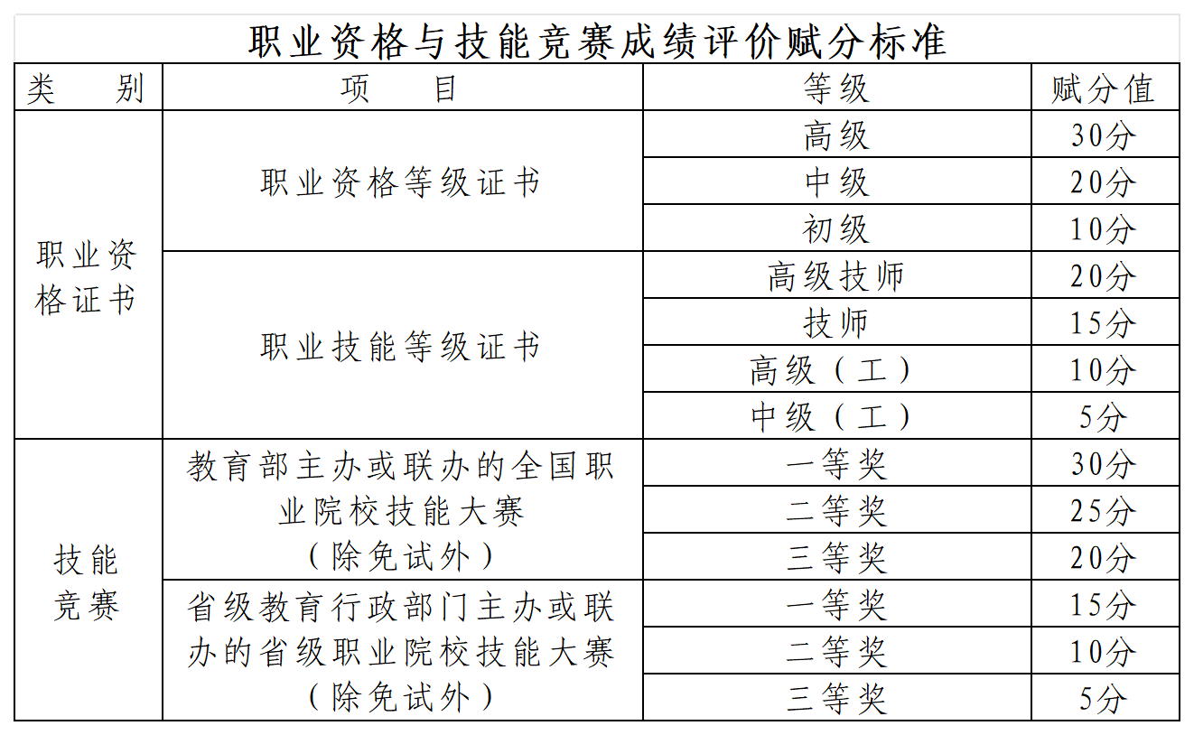 四、学生如提供有多个符合要求的职业资格证书或多个技能竞赛获奖项目,则分别取其中一个最高级别的证书或获奖项目予以赋分。